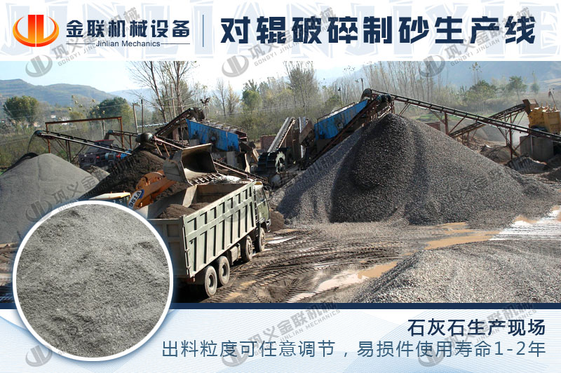 時(shí)產(chǎn)100噸對輥破碎機(jī)生產(chǎn)現(xiàn)場-石灰石破碎制砂